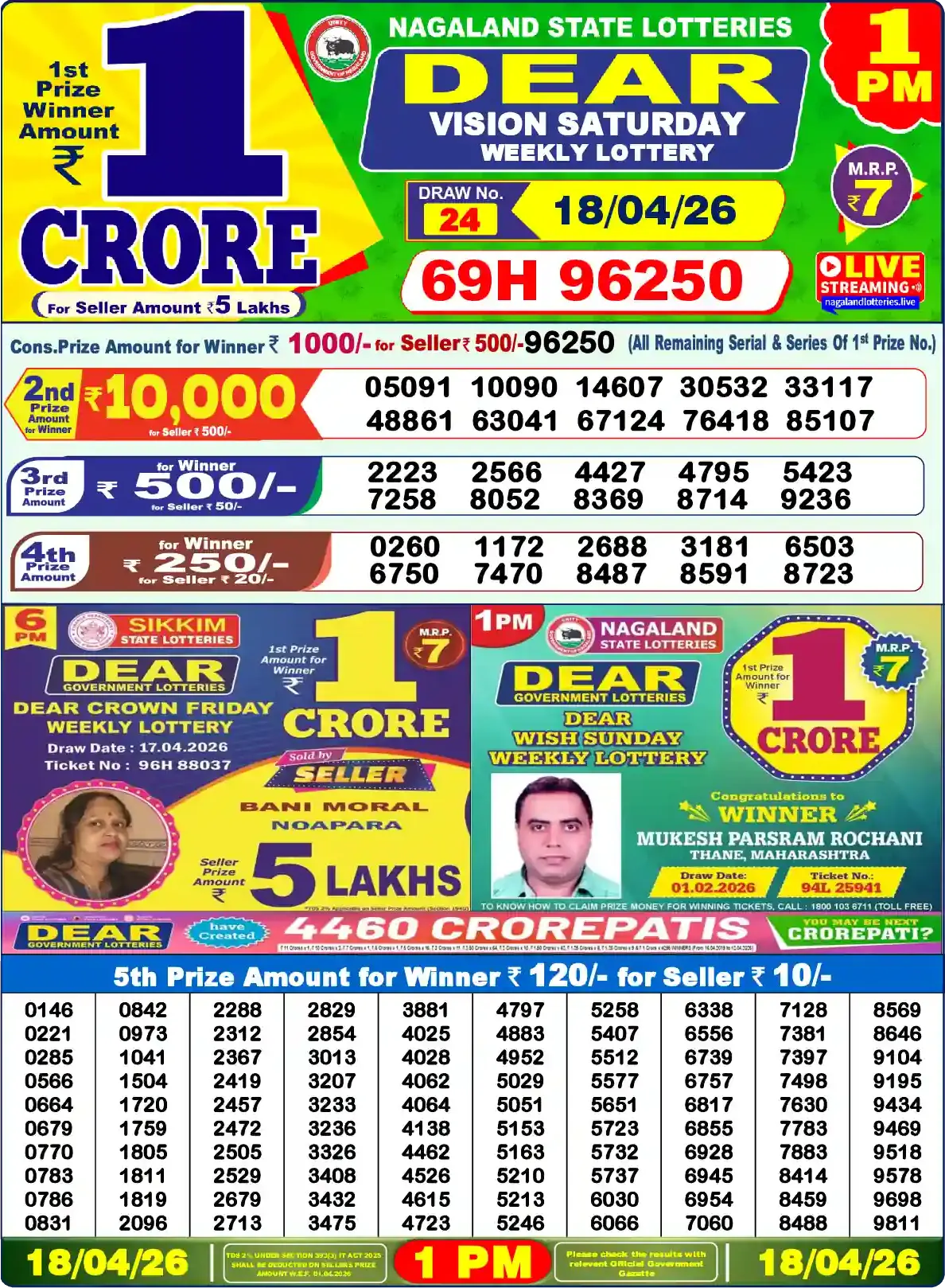 Do you want to check the results of the Nagaland State Lottery Result Today 1 PM, 6 PM, and 8 PM? You’re in the right place We provide all updated results of the Nagaland State Lottery every day, This Nagaland State Lottery Result Today 6pm has a 1st prize of 1 crore, 2nd Prize of 9000 Rupees, 3rd Prize of 450 Rupees, 4th Prize of 250 Rupees and 5th Prize of 120 Rupees. Nagaland Deer Lottery Results 18-04-2026 are now updated. Scroll down to see your lucky numbers