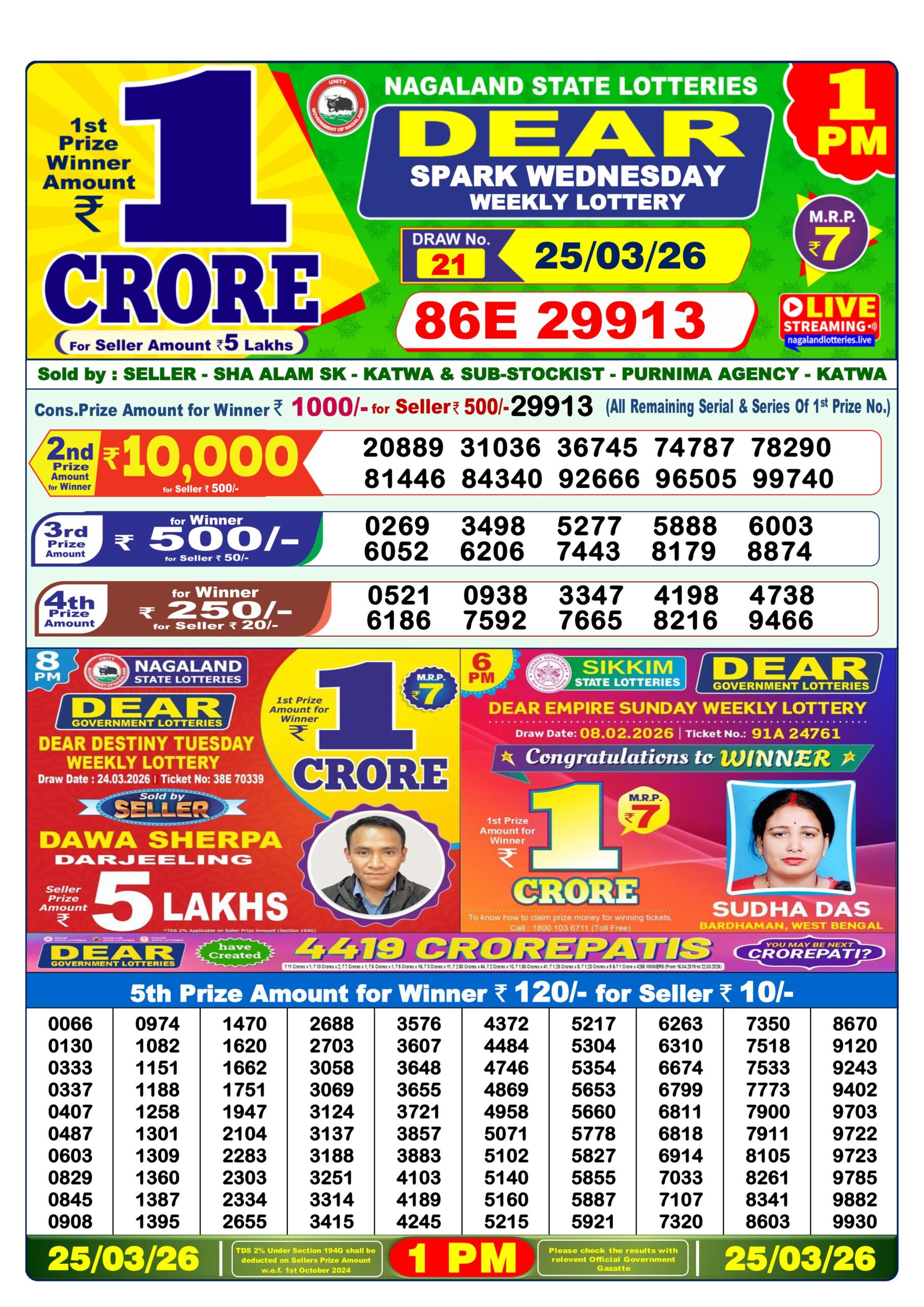 Want to see 25 Tarikh Ka Lottery Result ? You are at the right place. We provide all the updated results of Nagaland State Lottery every day. Today in this Nagaland State Lottery Results there is 1st prize of Rs. 1 crore, 2nd prize of Rs. 10000, 3rd prize of Rs. 500, 4th prize of Rs. 250 and 5th prize of Rs. 120. Nagaland Deer Lottery Results 25-03-2026 are now updated. Scroll down to see your lucky numbers.