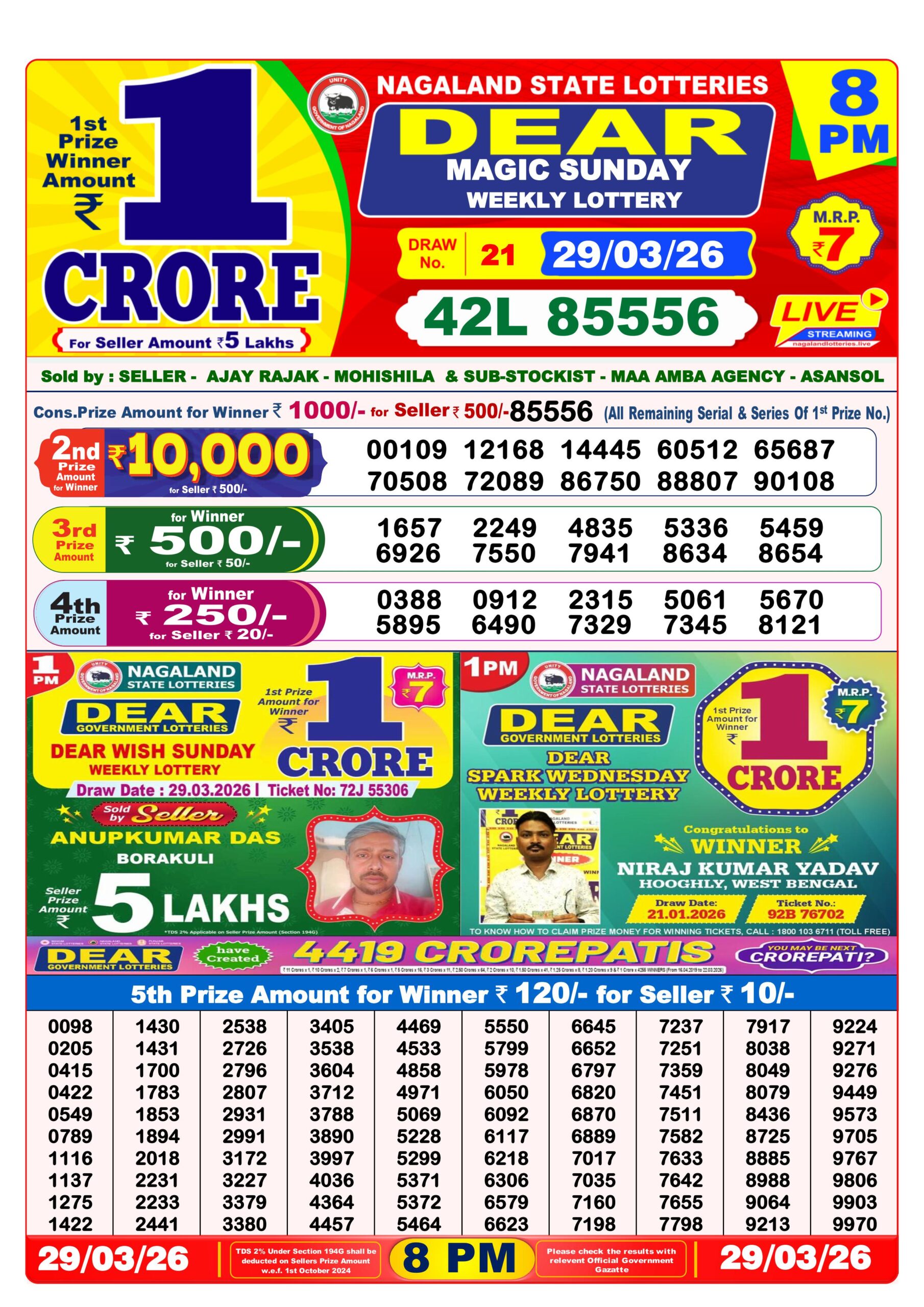 Want to see 29 Tarikh Ka Lottery Result ? You are at the right place. We provide all the updated results of Nagaland State Lottery every day. Today in this Nagaland State Lottery Results there is 1st prize of Rs. 1 crore, 2nd prize of Rs. 10000, 3rd prize of Rs. 500, 4th prize of Rs. 250 and 5th prize of Rs. 120. Nagaland Deer Lottery Results 29-03-2026 are now updated. Scroll down to see your lucky numbers.