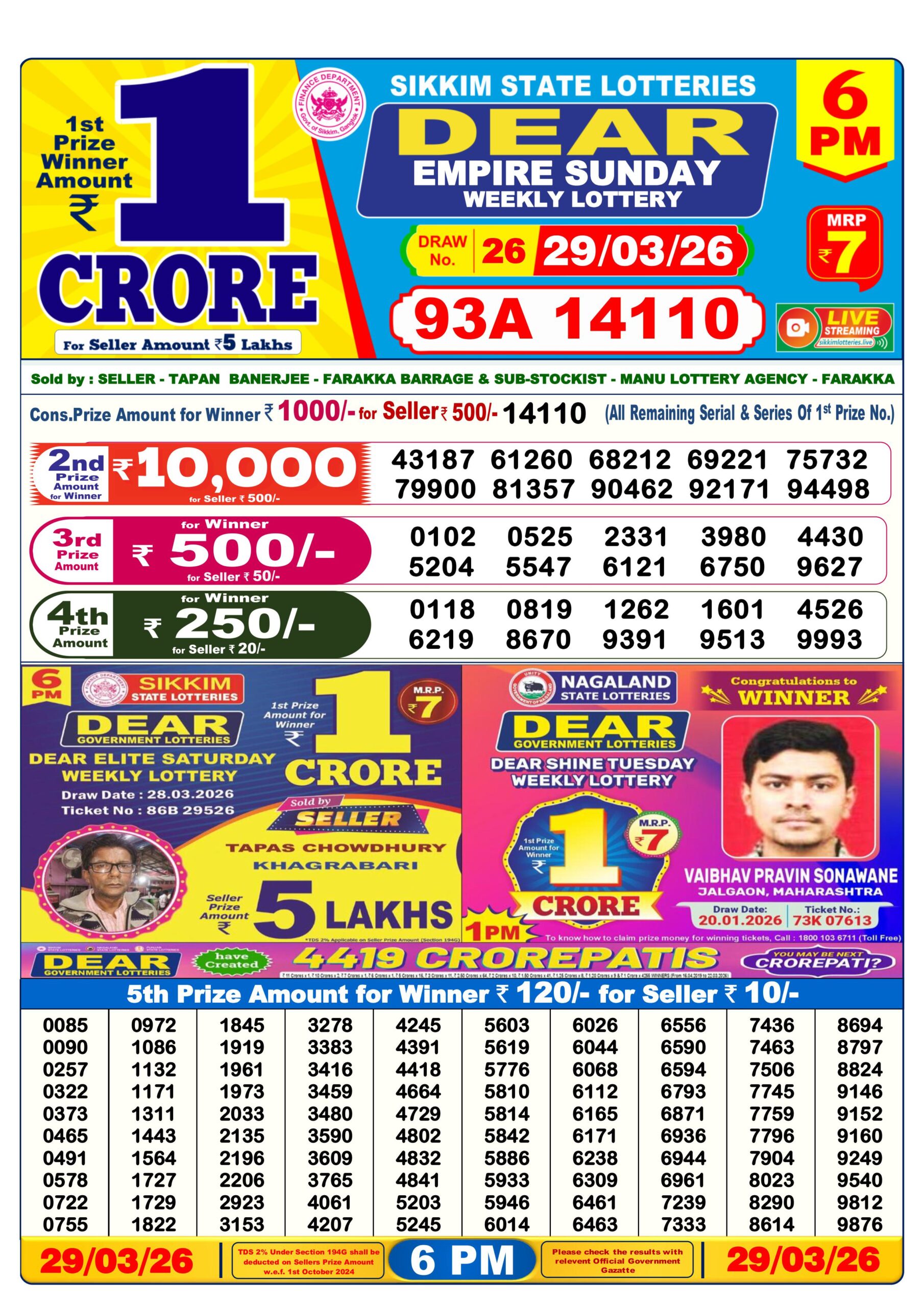 Want to see 29 Tarikh Ka Lottery Result ? You are at the right place. We provide all the updated results of Nagaland State Lottery every day. Today in this Nagaland State Lottery Results there is 1st prize of Rs. 1 crore, 2nd prize of Rs. 10000, 3rd prize of Rs. 500, 4th prize of Rs. 250 and 5th prize of Rs. 120. Nagaland Deer Lottery Results 29-03-2026 are now updated. Scroll down to see your lucky numbers.