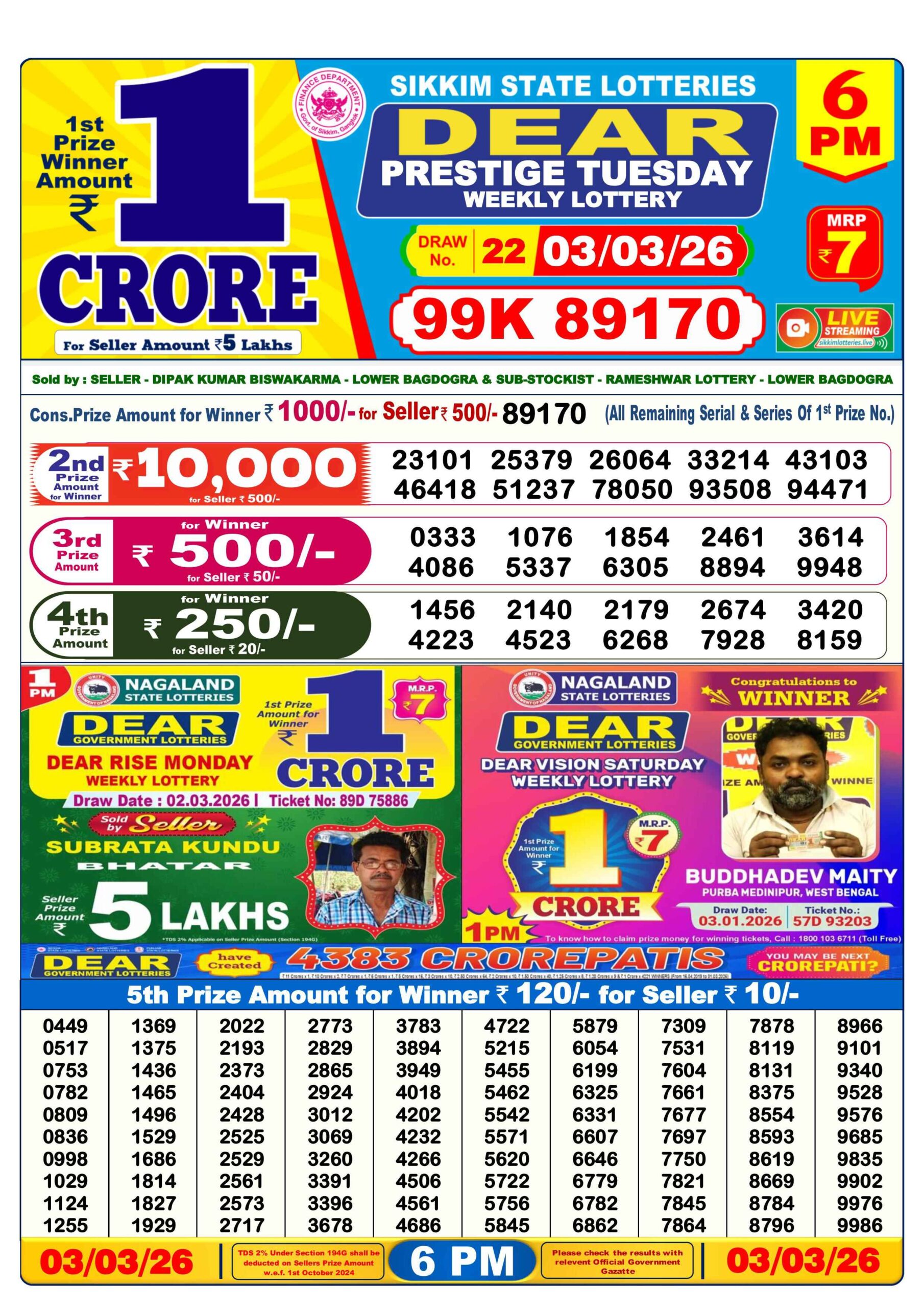 Do you want to check the results of the 3 Tarikh Nagaland Lottery Result Today 1 PM, 6 PM, and 8 PM? You’re in the right place We provide all updated results of the Nagaland State Lottery every day, This Nagaland State Lottery Result Today 6pm has a 1st prize of 1 crore, 2nd Prize of 9000 Rupees, 3rd Prize of 450 Rupees, 4th Prize of 250 Rupees and 5th Prize of 120 Rupees. Nagaland Deer Lottery Results 03-03-2026 are now updated. Scroll down to see your lucky numbers