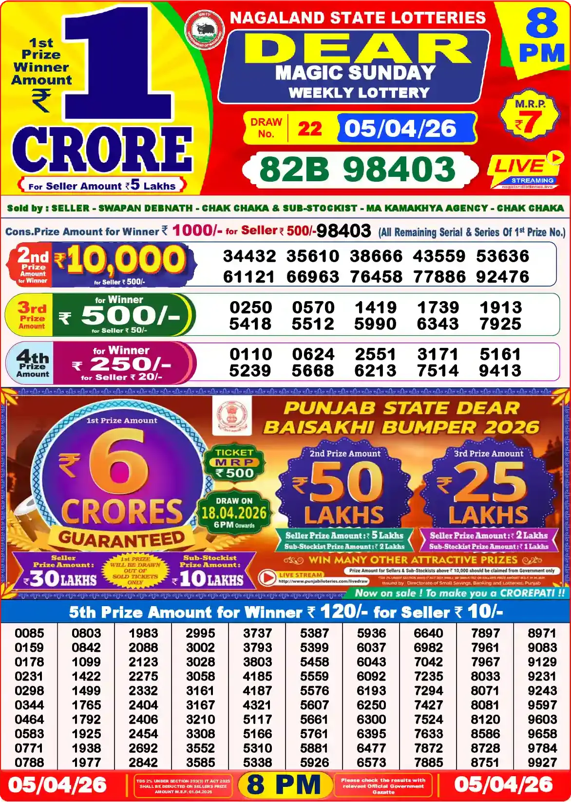 Want to see 5 Tarikh Ka Lottery Result ? You are at the right place. We provide all the updated results of Nagaland State Lottery every day. Today in this Nagaland State Lottery Results there is 1st prize of Rs. 1 crore, 2nd prize of Rs. 10000, 3rd prize of Rs. 500, 4th prize of Rs. 250 and 5th prize of Rs. 120. Nagaland Deer Lottery Results 05-04-2026 are now updated. Scroll down to see your lucky numbers.