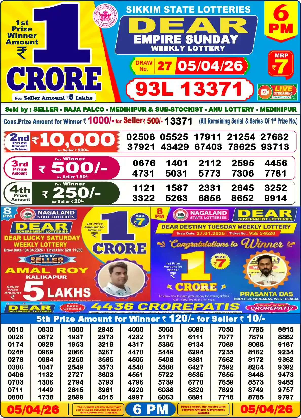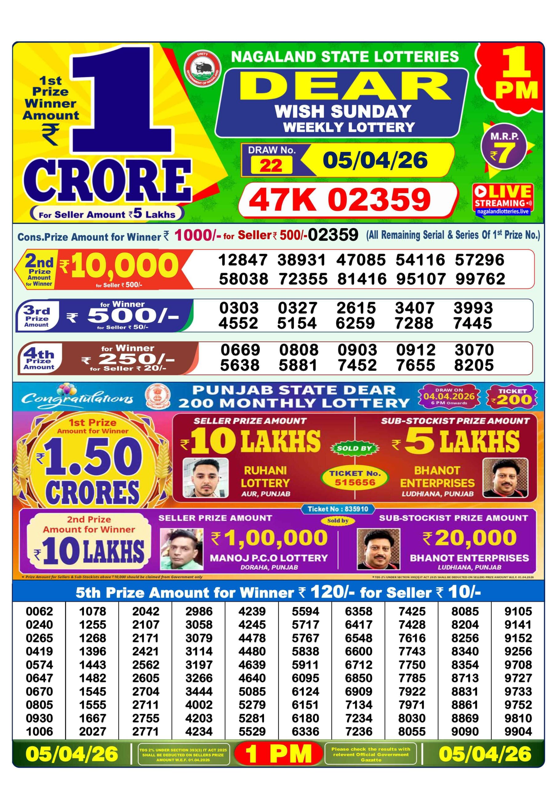 Want to see 5 Tarikh Ka Lottery Sambad ? You are at the right place. We provide all the updated results of Nagaland State Lottery every day. Today in this Nagaland State Lottery Results there is 1st prize of Rs. 1 crore, 2nd prize of Rs. 10000, 3rd prize of Rs. 500, 4th prize of Rs. 250 and 5th prize of Rs. 120. Nagaland Deer Lottery Results 05-04-2026 are now updated. Scroll down to see your lucky numbers.