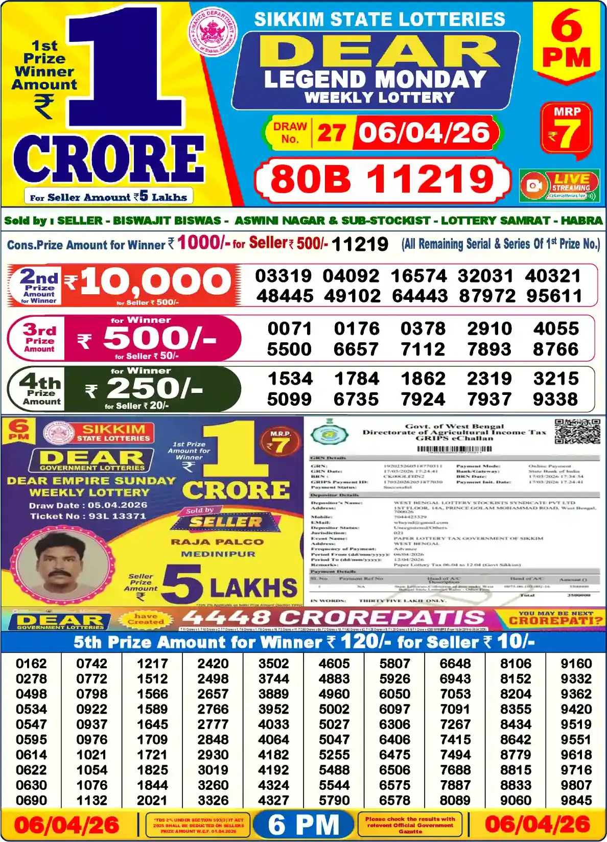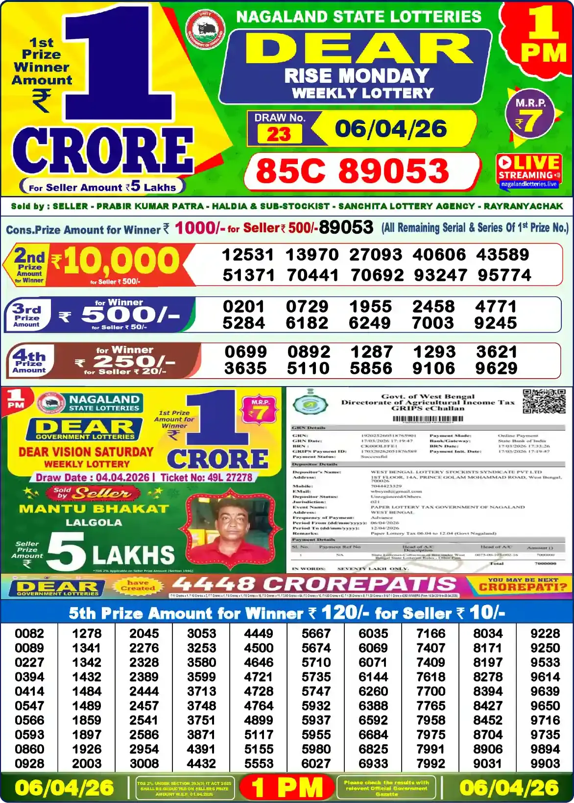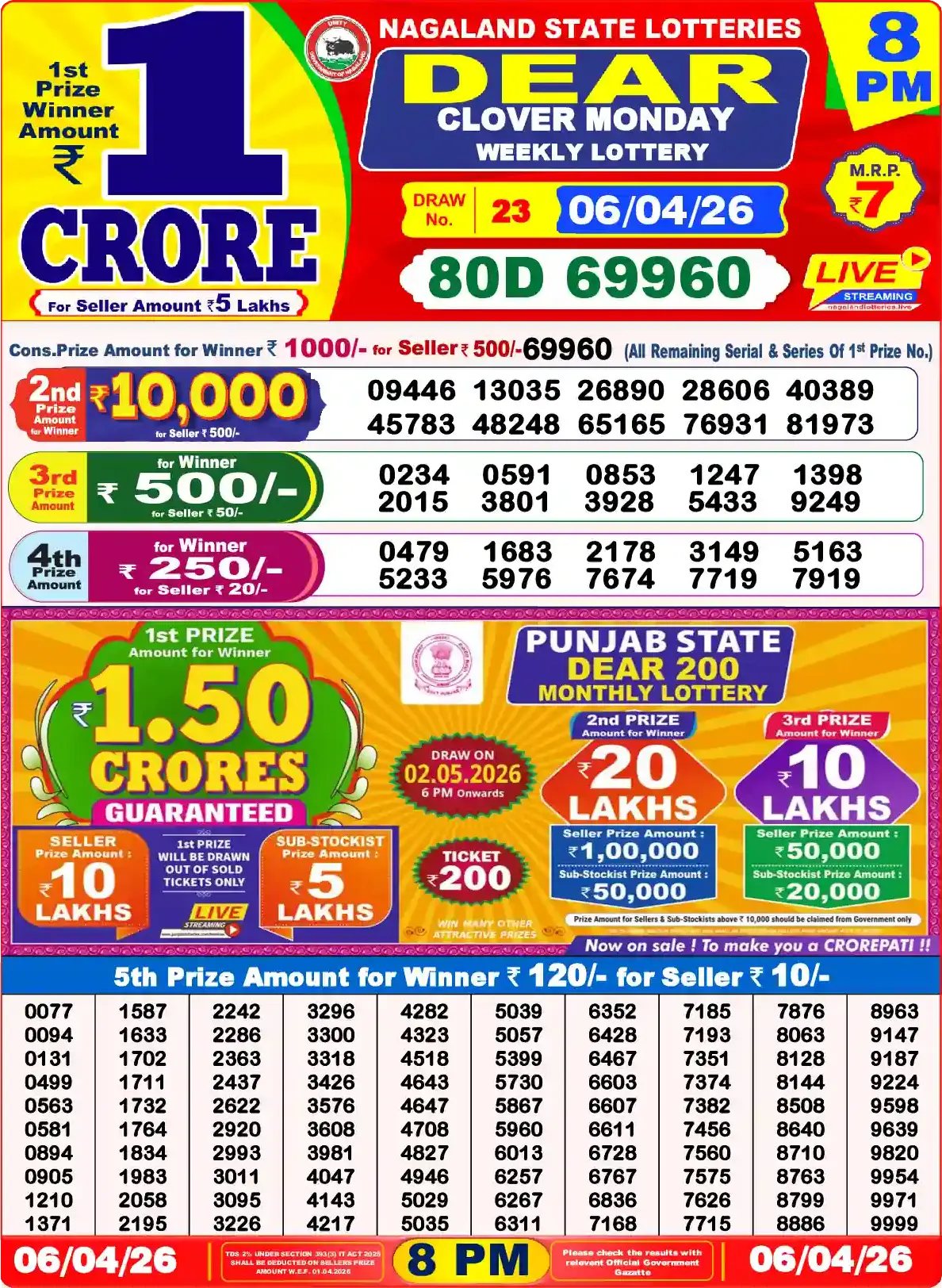 Want to see 6 Tarikh Ka Lottery Result ? You are at the right place. We provide all the updated results of Nagaland State Lottery every day. Today in this Nagaland State Lottery Results there is 1st prize of Rs. 1 crore, 2nd prize of Rs. 10000, 3rd prize of Rs. 500, 4th prize of Rs. 250 and 5th prize of Rs. 120. Nagaland Deer Lottery Results 06-04-2026 are now updated. Scroll down to see your lucky numbers.