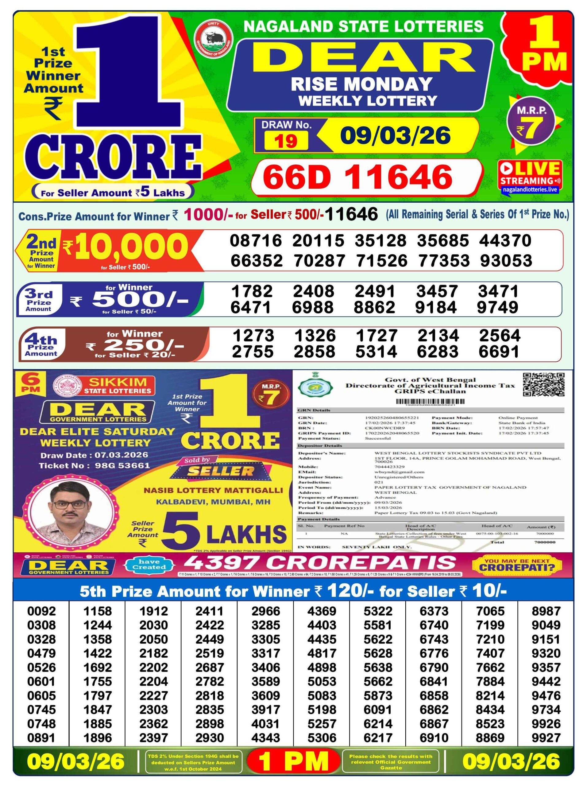 Lottery Sambad Today Nagaland OLD RESULT Do you want to check the results of the Lottery for 1 PM, 6 PM, and 8 PM? You’re in the right place We provide all updated results of the Nagaland State Lottery every day, This Nagaland State Lottery Result Today 6pm has a 1st prize of 1 crore, 2nd Prize of 9000 Rupees, 3rd Prize of 450 Rupees, 4th Prize of 250 Rupees and 5th Prize of 120 Rupees. Nagaland Deer Lottery Results   are now updated. Scroll down to see your lucky numbers