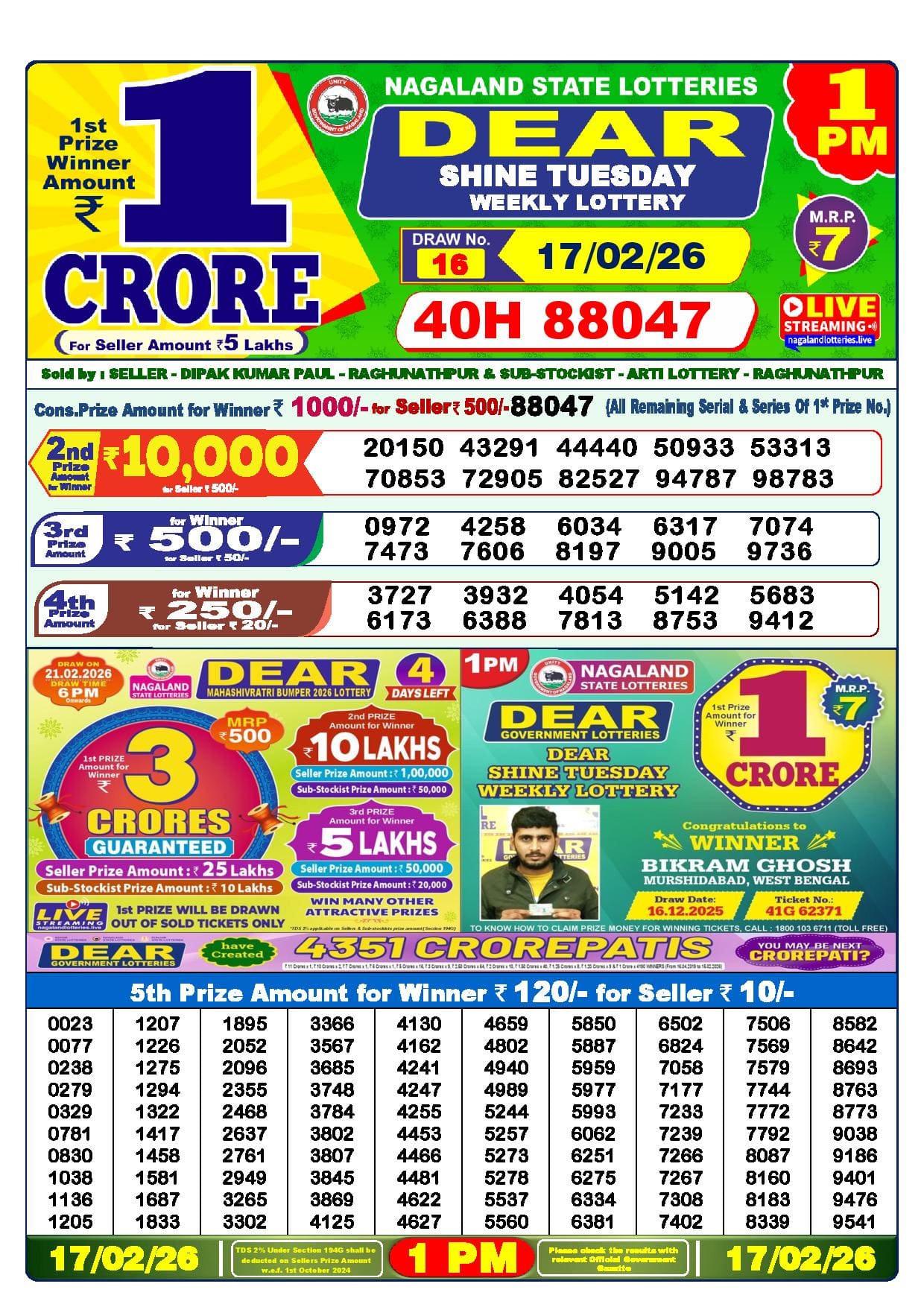 Lottery Sambad Today Nagaland OLD RESULT Do you want to check the results of the Lottery for 1 PM, 6 PM, and 8 PM? You’re in the right place We provide all updated results of the Nagaland State Lottery every day, This Nagaland State Lottery Result Today 6pm has a 1st prize of 1 crore, 2nd Prize of 9000 Rupees, 3rd Prize of 450 Rupees, 4th Prize of 250 Rupees and 5th Prize of 120 Rupees. Nagaland Deer Lottery Results   are now updated. Scroll down to see your lucky numbers