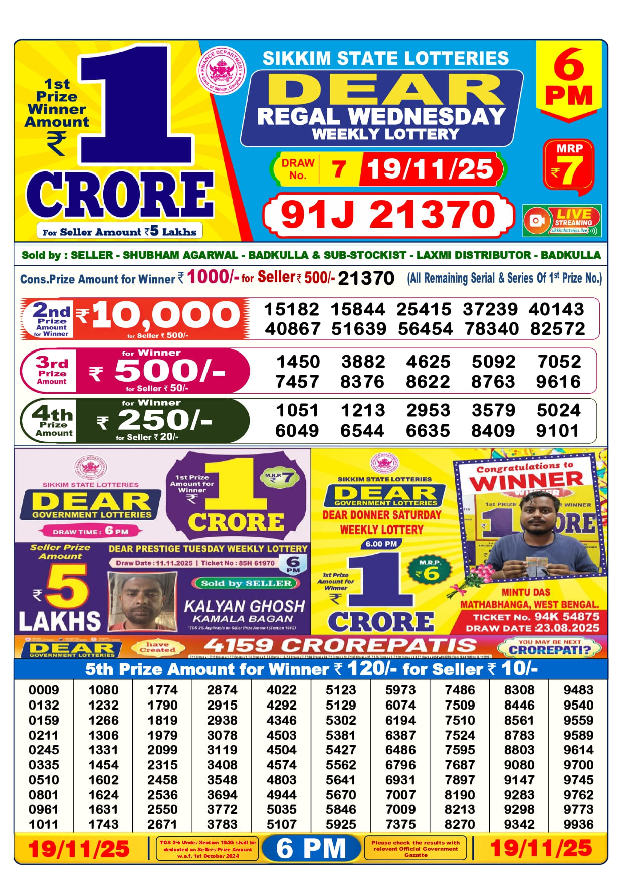 Lottery Sambad Today Nagaland Result Do you want to check the results of the 19 Tarik Lottery for 1 PM, 6 PM, and 8 PM? You’re in the right place We provide all updated results of the Nagaland State Lottery every day, This Nagaland State Lottery Result Today 6pm has a 1st prize of 1 crore, 2nd Prize of 9000 Rupees, 3rd Prize of 450 Rupees, 4th Prize of 250 Rupees and 5th Prize of 120 Rupees. Nagaland Deer Lottery Results 19 November 2025 are now updated. Scroll down to see your lucky numbers