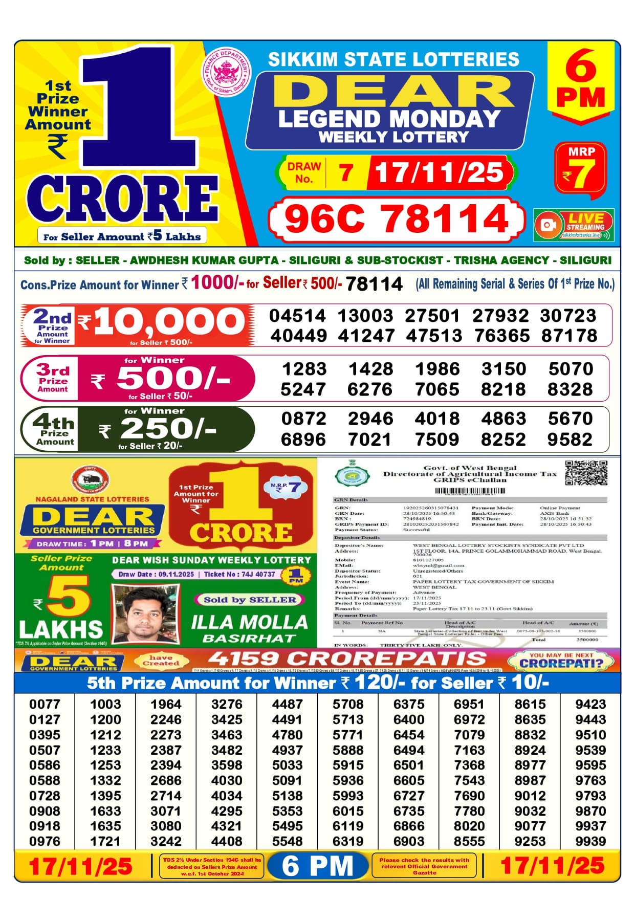 Lottery Sambad Today Nagaland Result Do you want to check the results of the 17 Tarik Lottery for 1 PM, 6 PM, and 8 PM? You’re in the right place We provide all updated results of the Nagaland State Lottery every day, This Nagaland State Lottery Result Today 6pm has a 1st prize of 1 crore, 2nd Prize of 9000 Rupees, 3rd Prize of 450 Rupees, 4th Prize of 250 Rupees and 5th Prize of 120 Rupees. Nagaland Deer Lottery Results 17 November 2025 are now updated. Scroll down to see your lucky numbers