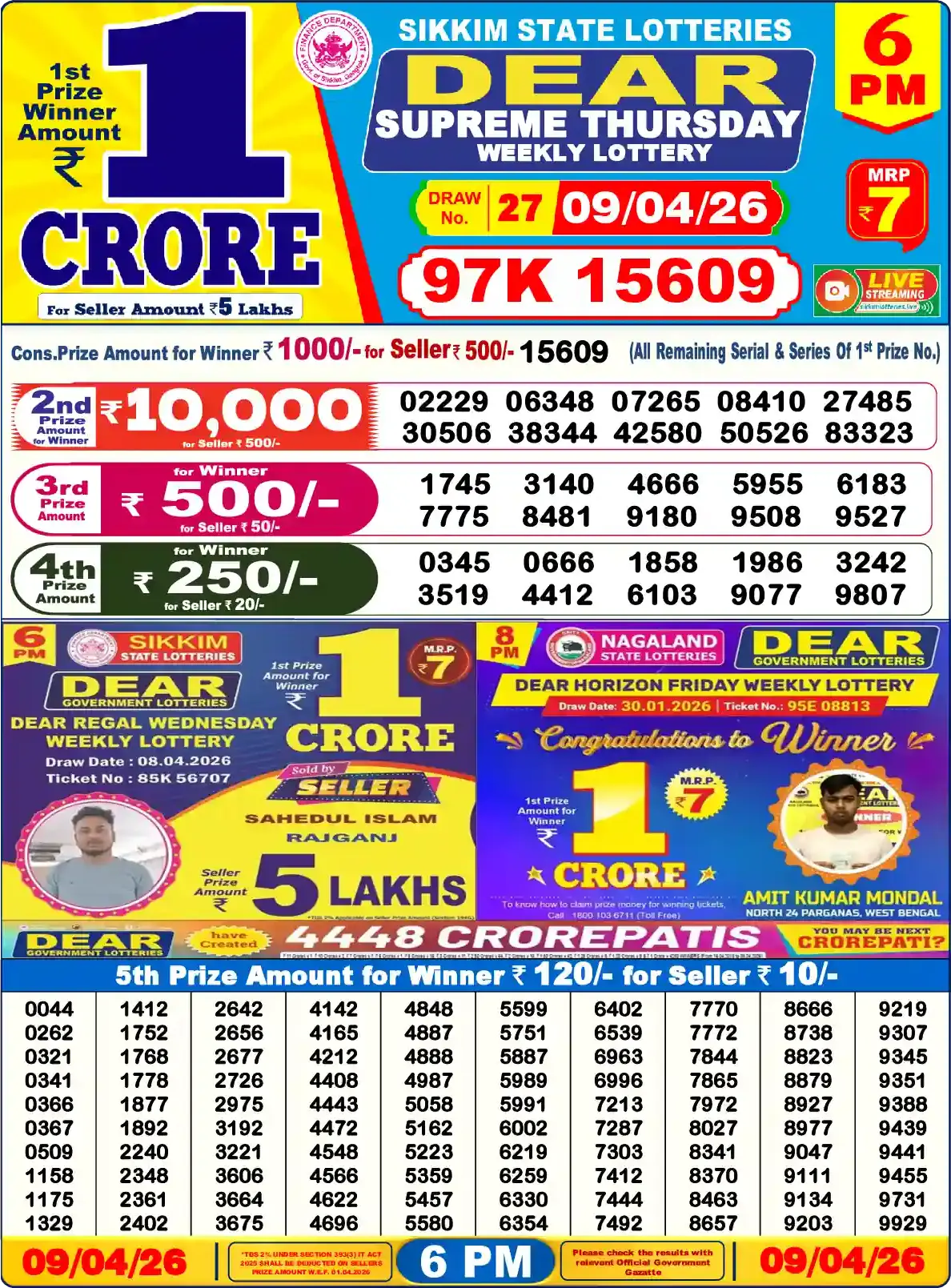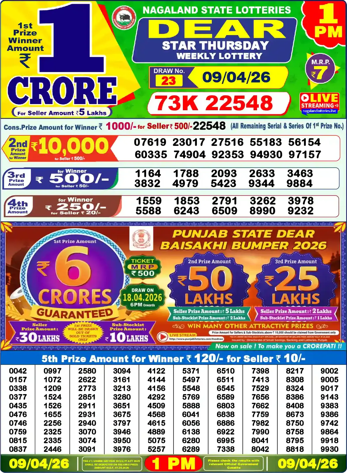 I’mDo you want to check the results of the Nagaland State Lottery 9 Tarikh Today 1 PM, 6 PM, and 8 PM? You’re in the right place We provide all updated results of the Nagaland State Lottery every day, This Nagaland State Lottery Result Today 6pm has a 1st prize of 1 crore, 2nd Prize of 9000 Rupees, 3rd Prize of 450 Rupees, 4th Prize of 250 Rupees and 5th Prize of 120 Rupees. Nagaland Deer Lottery Results 09-04-2026 are now updated. Scroll down to see your lucky numbers